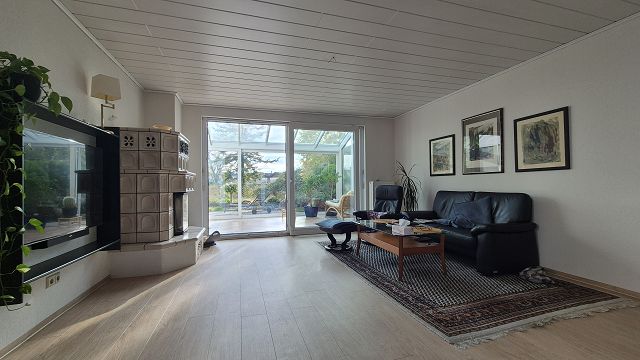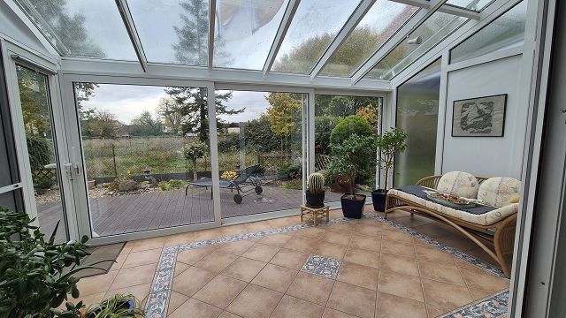 Der beheizte Wintergarten schafft eine besondere Wohnatmosphäre: Hier genießen Sie auch in der kälteren Jahreszeit das Gefühl “draußen zu sein”. Die angrenzende Terrasse rundet das Outdoorwohnen gelungen ab.