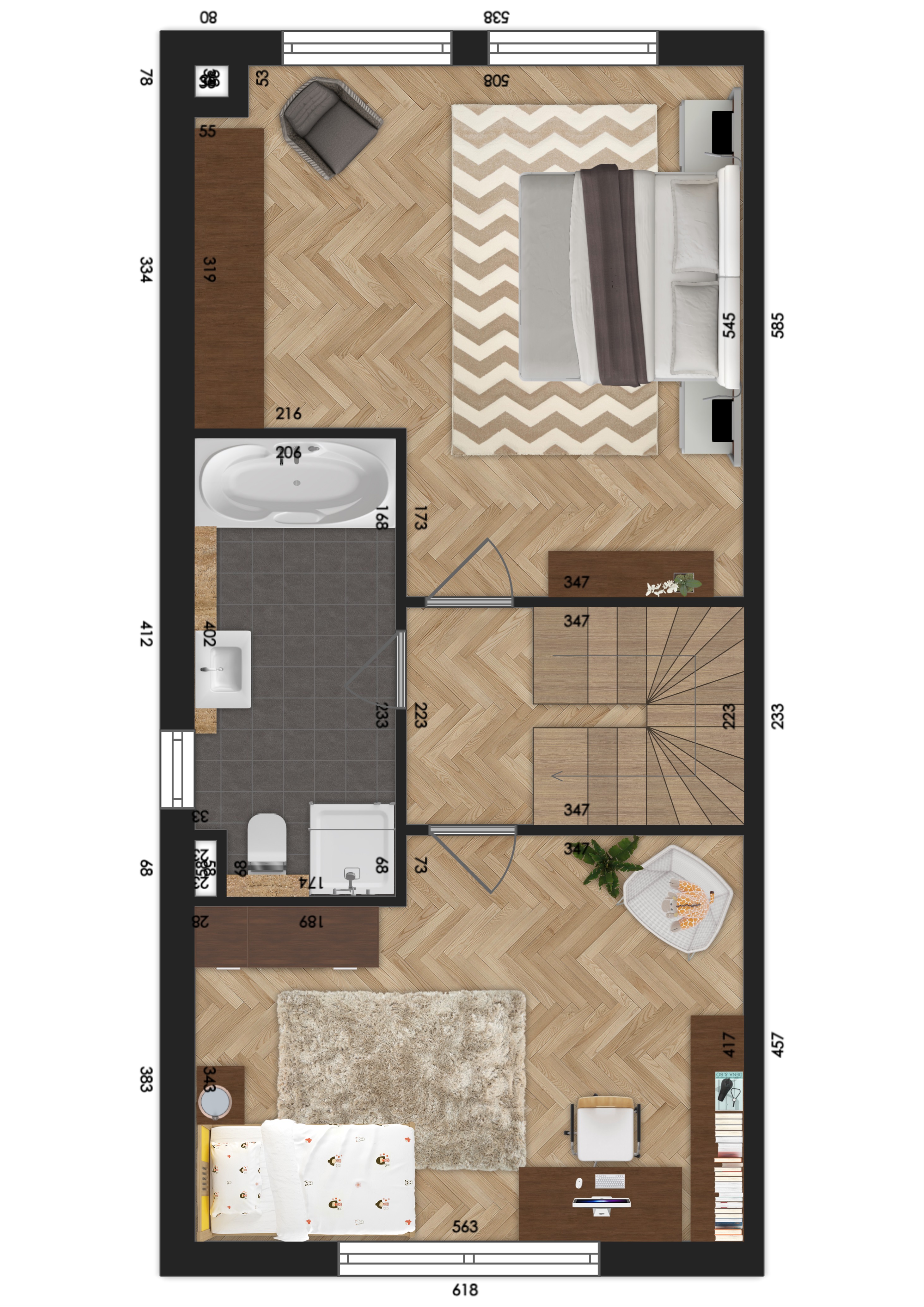 Im Obergeschoss stehen zwei Schlafzimmer und ein Tageslichtbadezimmer mit Dusche und Badewanne zu Verfügung. Das Dachstudio bietet zusätzlichen Raum, ideal als Homeoffice, Gästezimmer oder Rückzugsort.