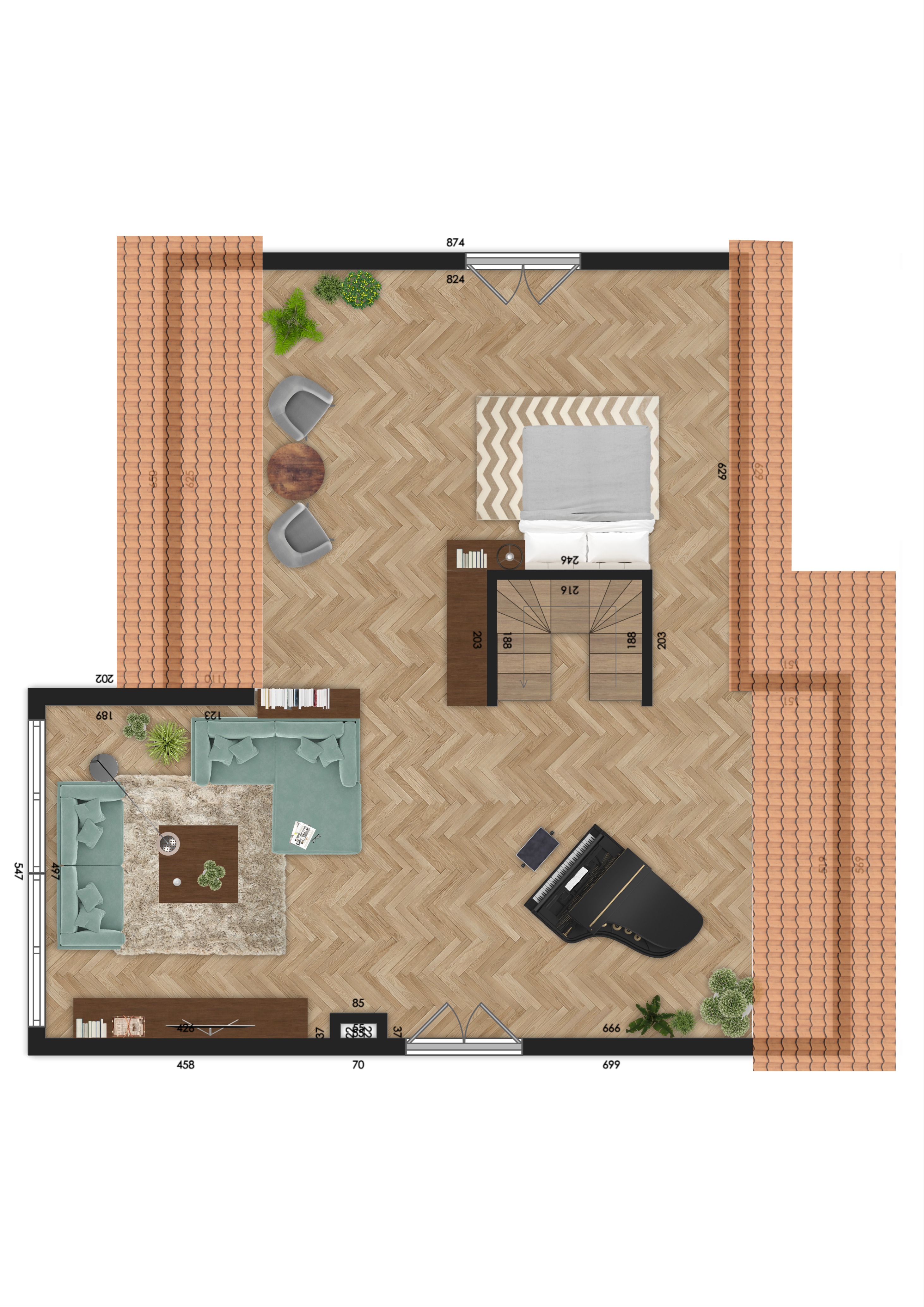 – großes Dachstudio mit rund 75 m². Eine Unterteilung dieses Raumes in mehrere Räume ist möglich